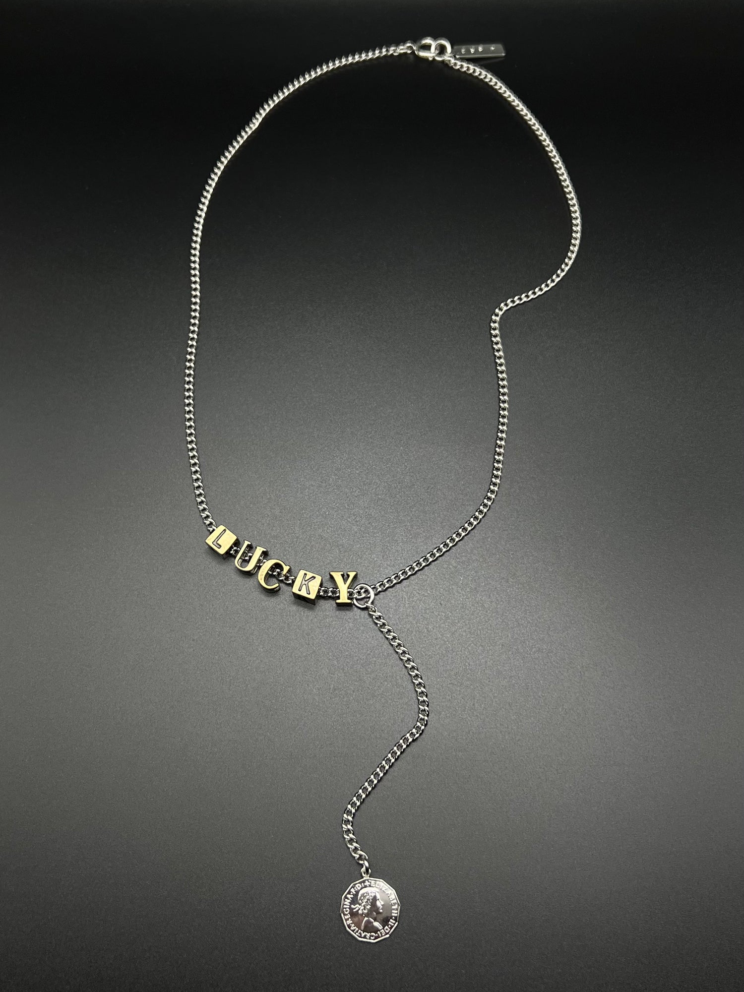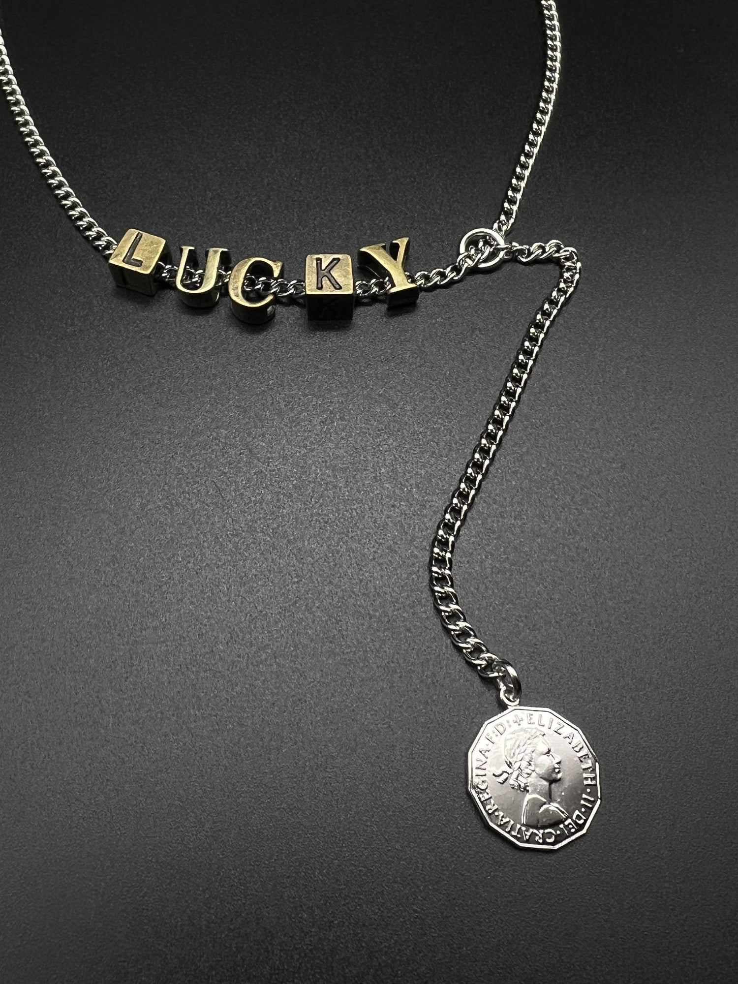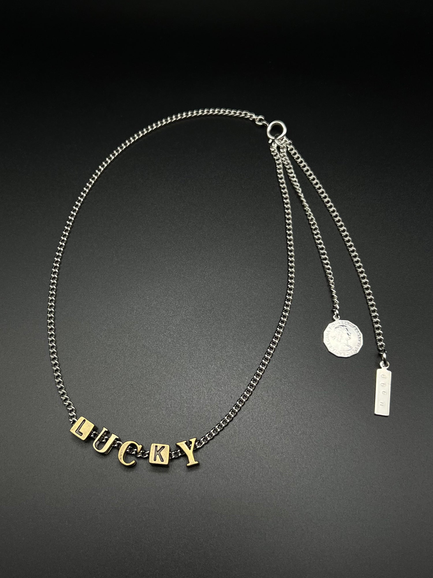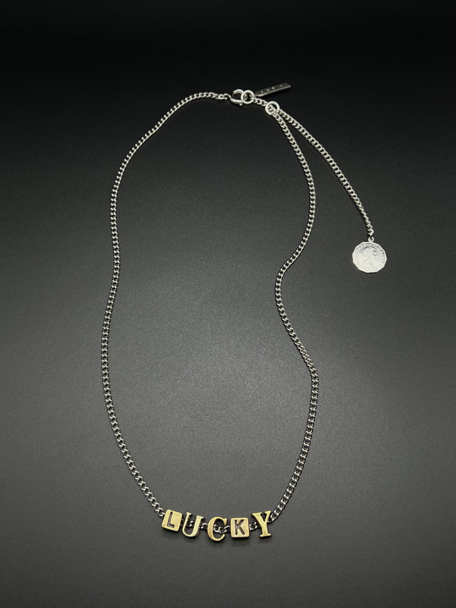 "LUCKY"モチーフネックレス。揺れるトップのコインモチーフをスライドさせて自由に長さを調整することができます。ロングネックレス、チョーカー風などスタイリングに合わせてお楽しみ下さい。オリジナルネームプレート付き。ユニセックスで着用可能。