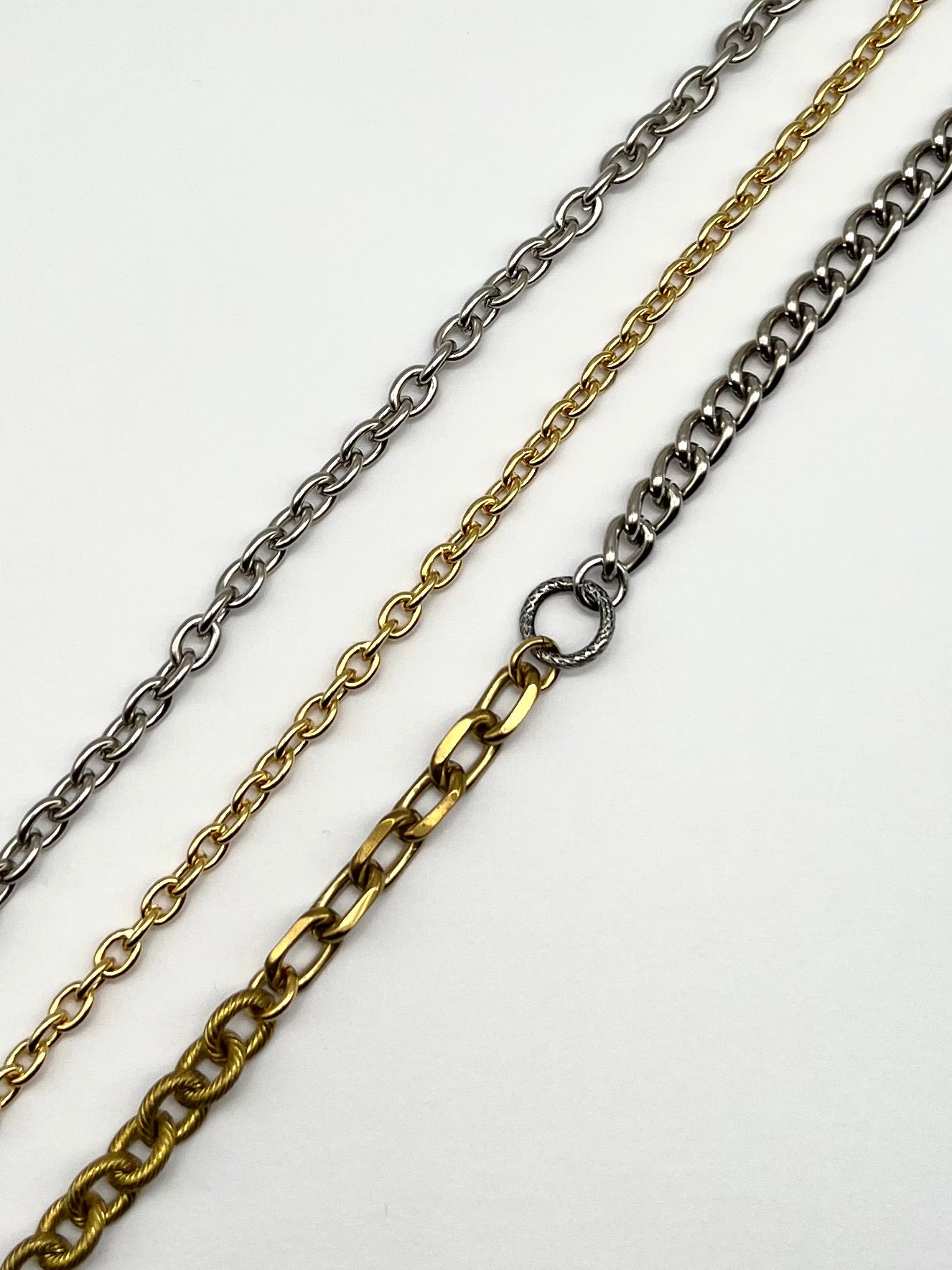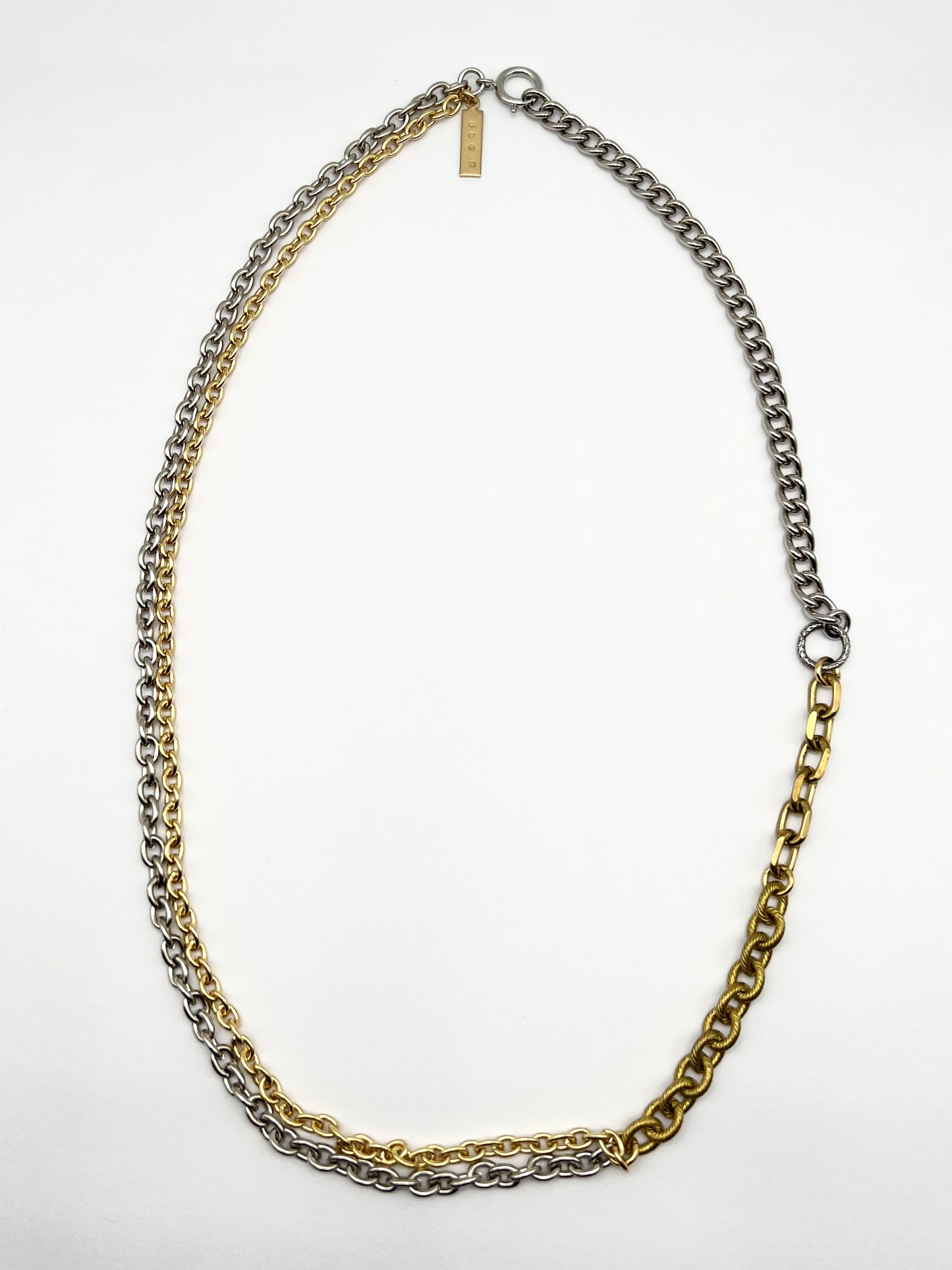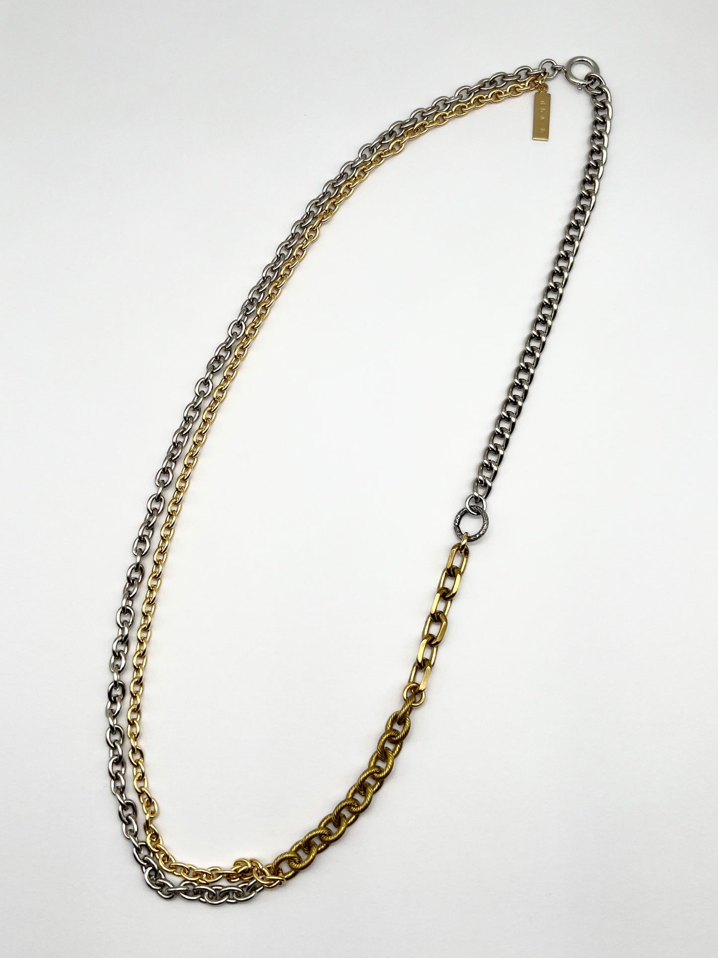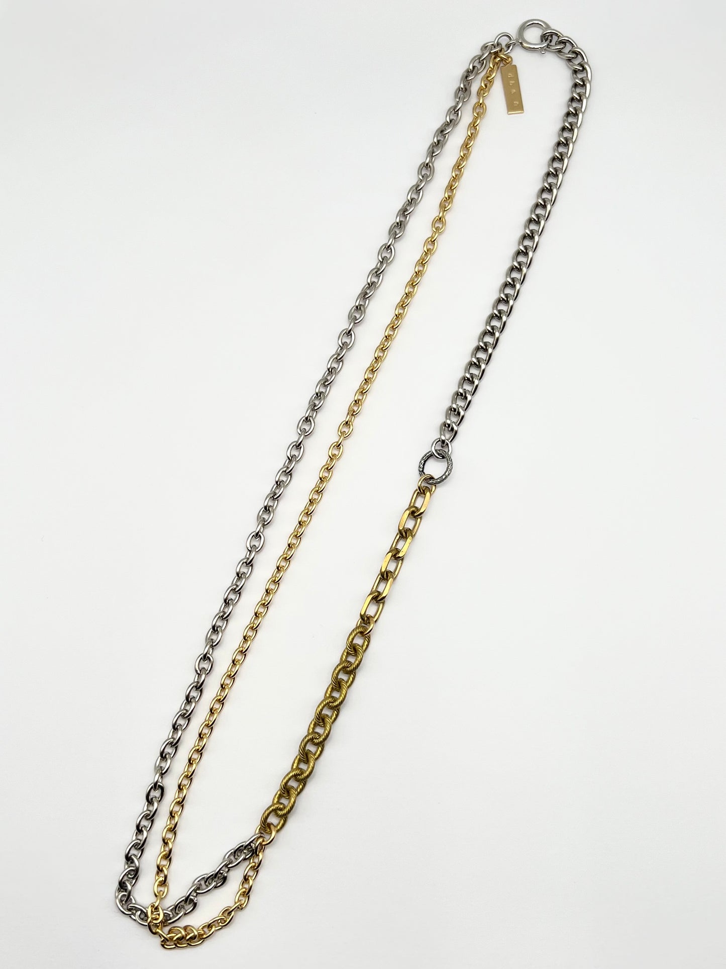 5種類のチェーンを繋ぎ合わせ、イタリア製のサークルパーツをポイントにしたチェーンネックレス。ロング、ショート、長さを調整できます。オリジナルネームプレート付き。