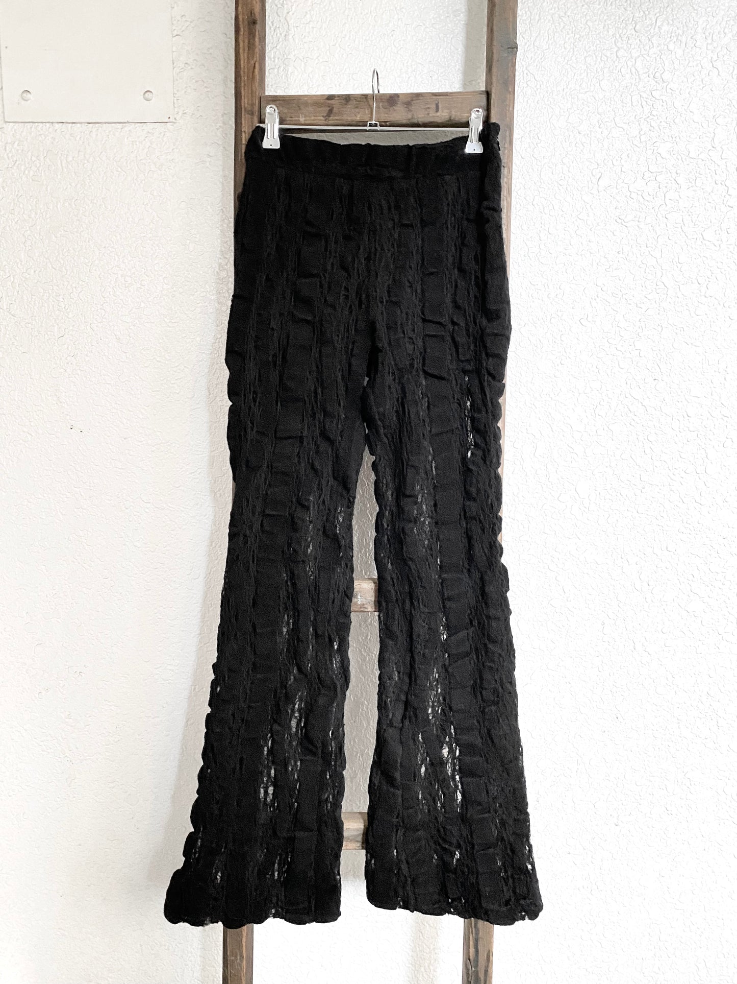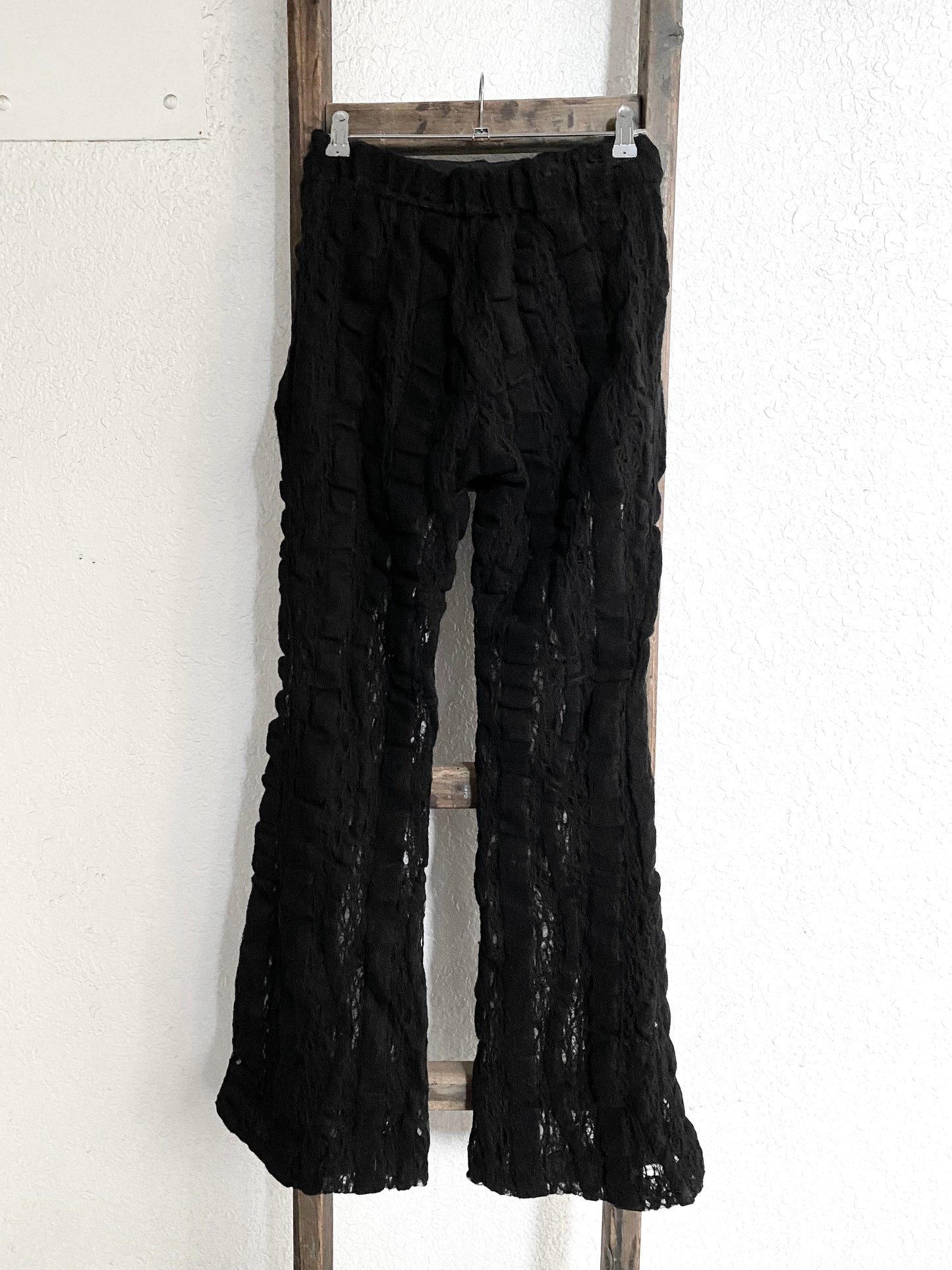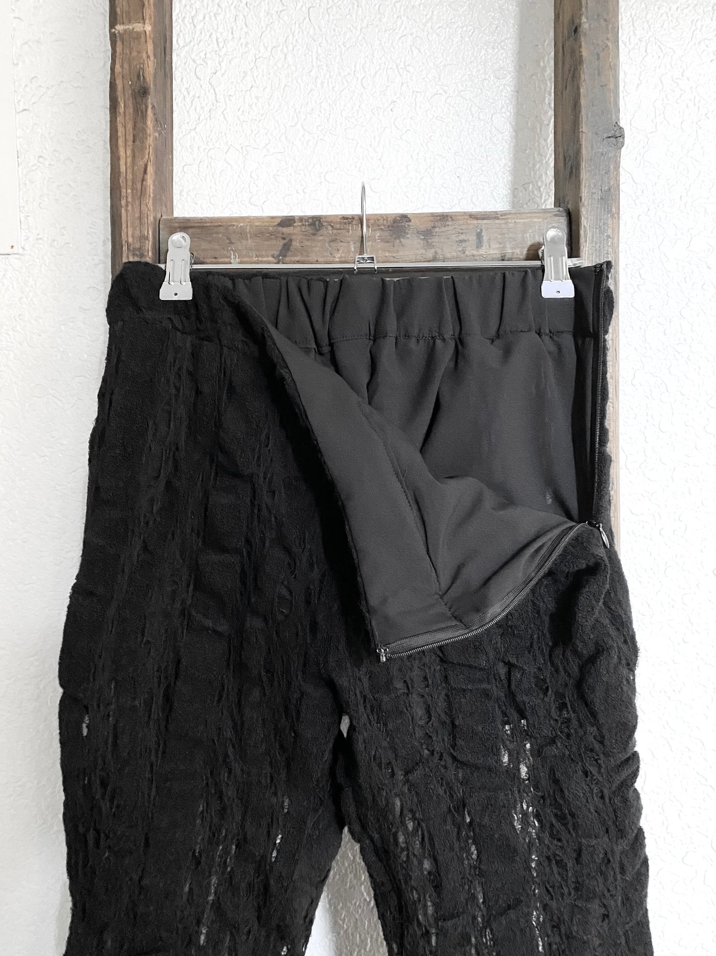 ハイライズパンツ、バックウエストバンド、サイドファスナー、インナーショートペチコート付き。フレアレッグ仕上げ、2サイズ展開。
