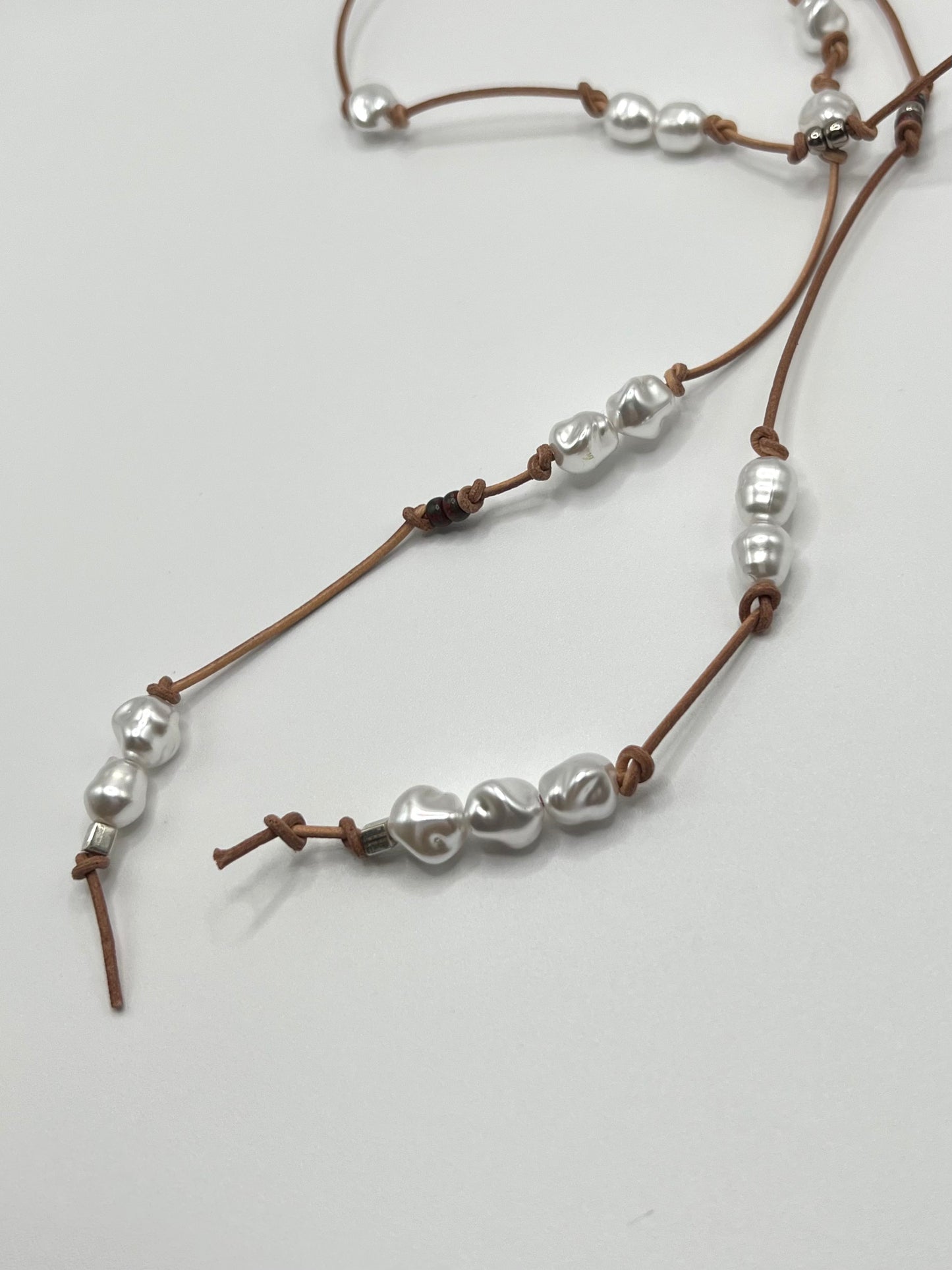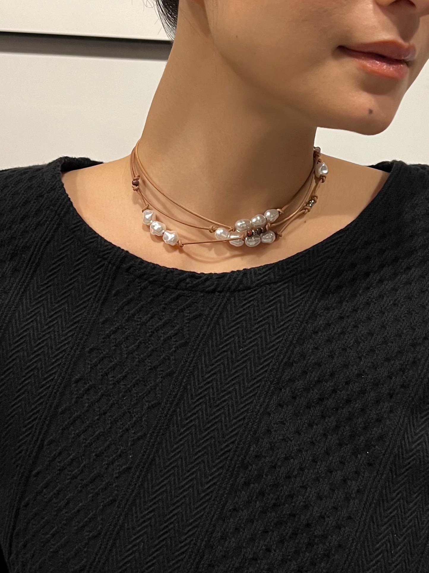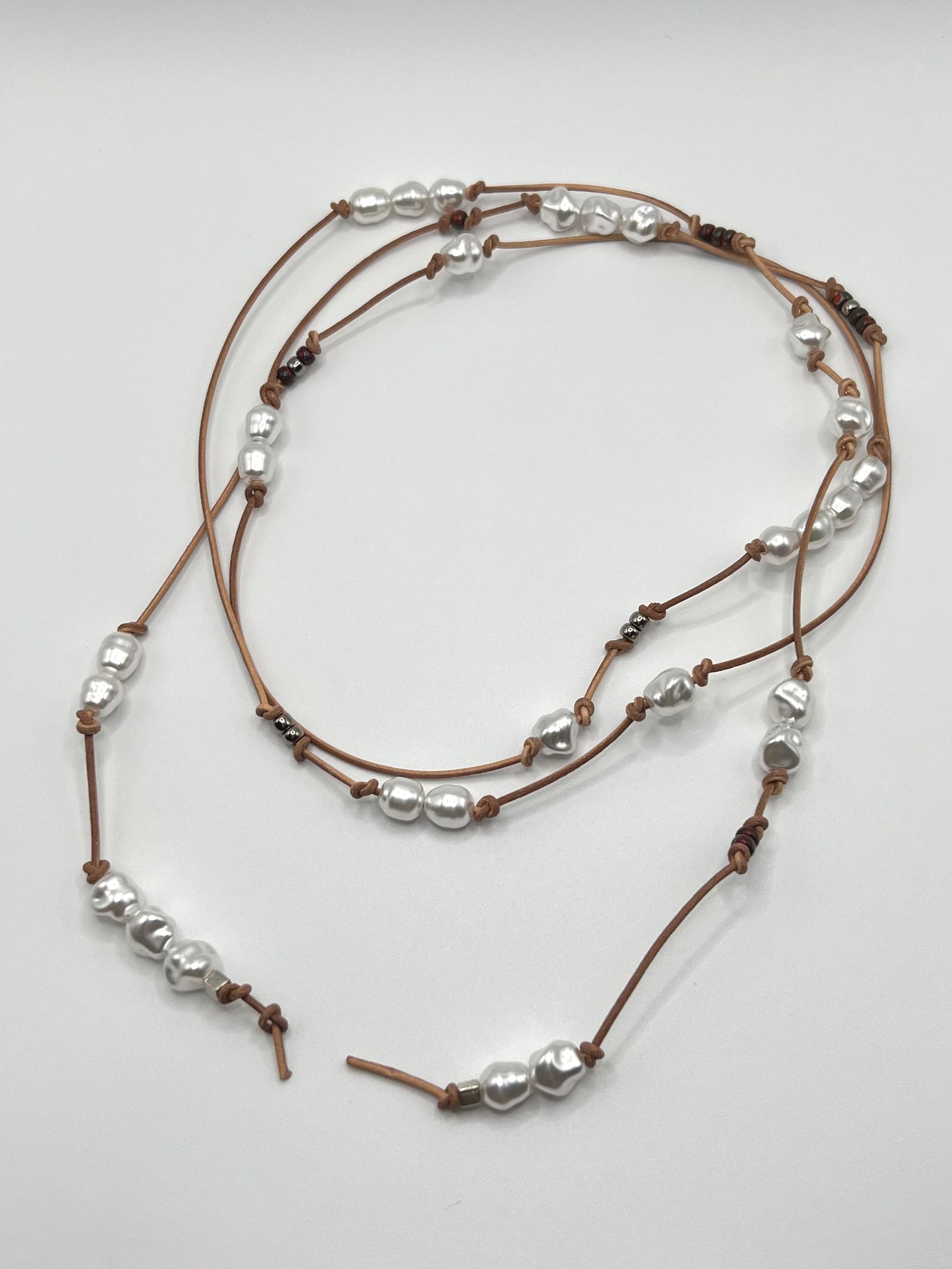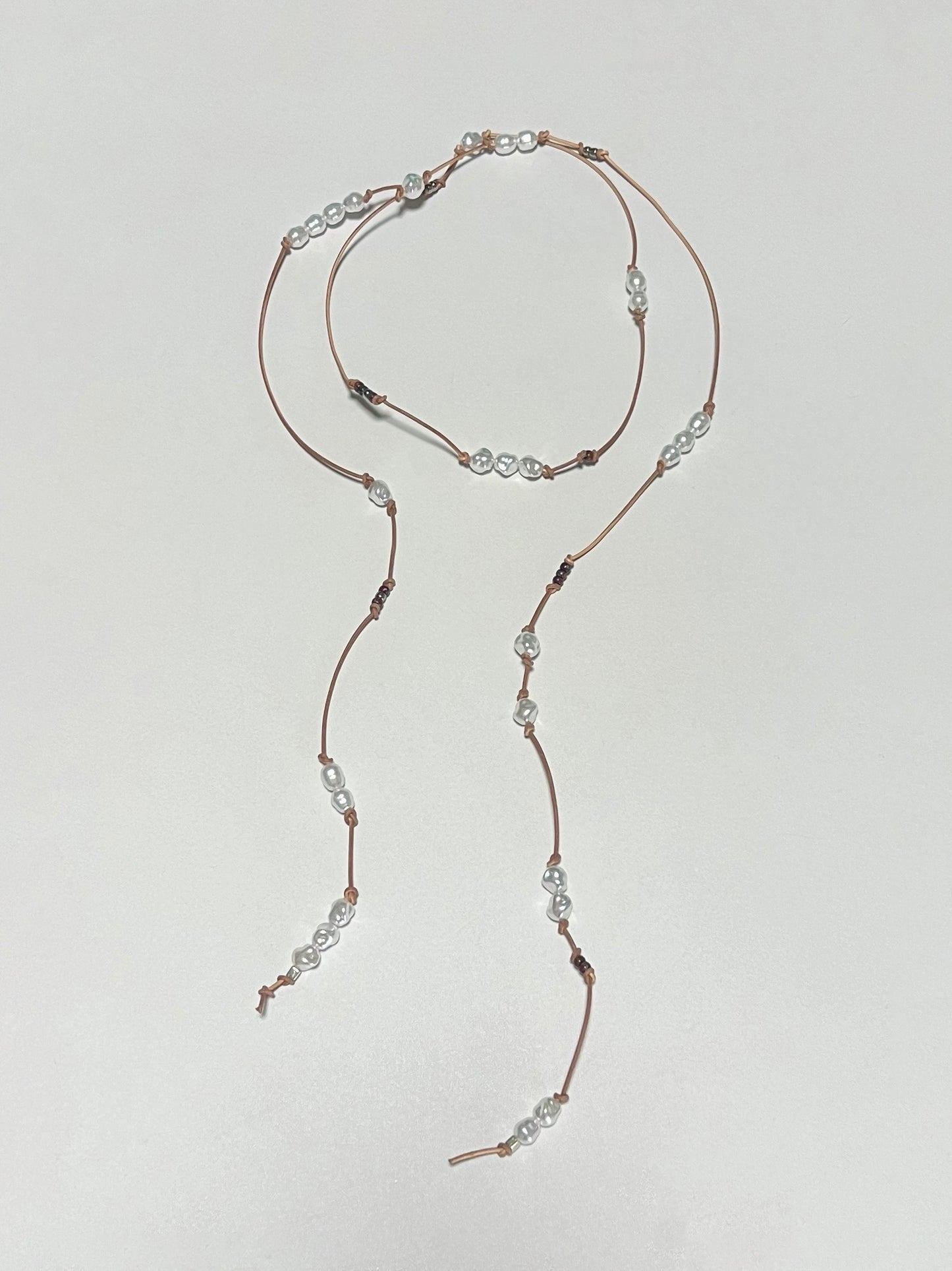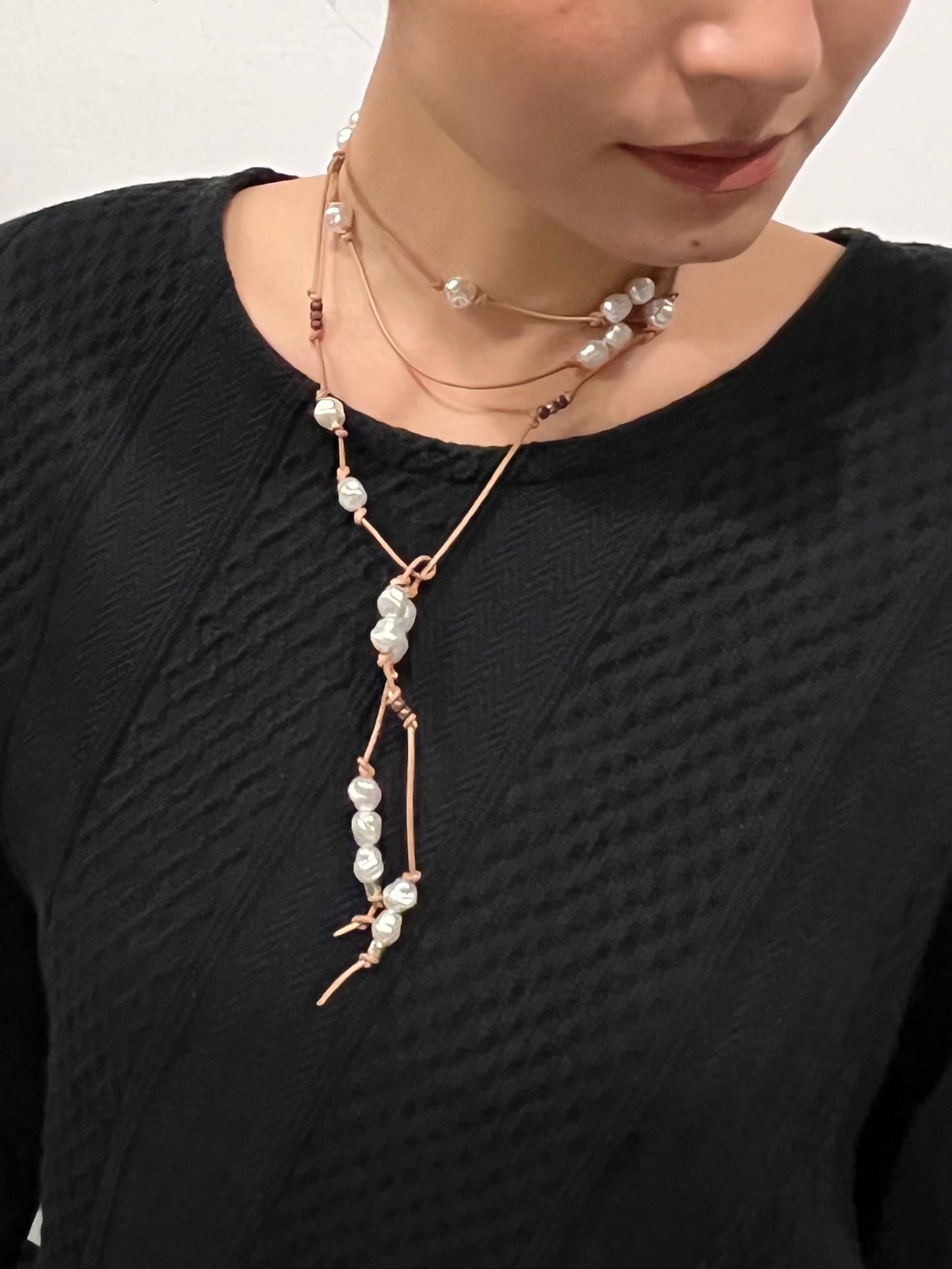 革紐とパール素材を組み合わせた新感覚のデザインネックレス。チョーカー風に結んだり、垂らしてロングネックレスなどお好みのスタイルでアレンジ可能です。