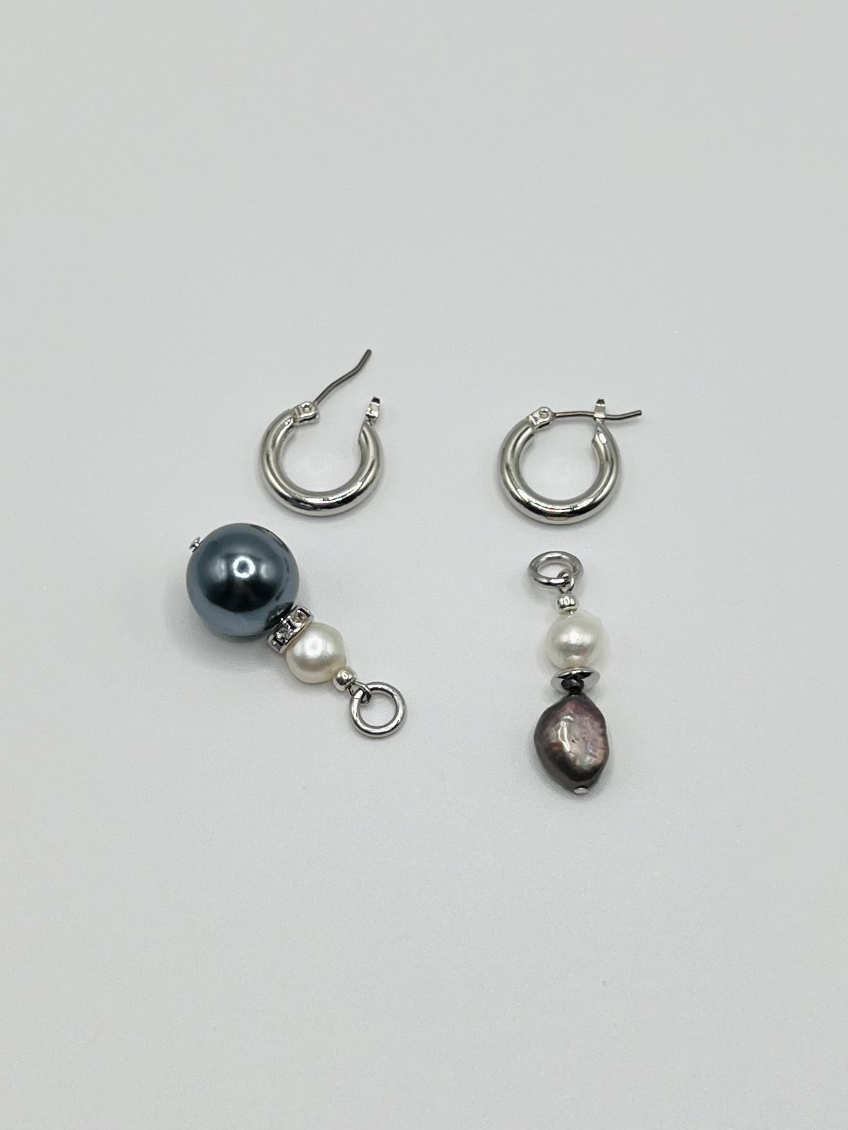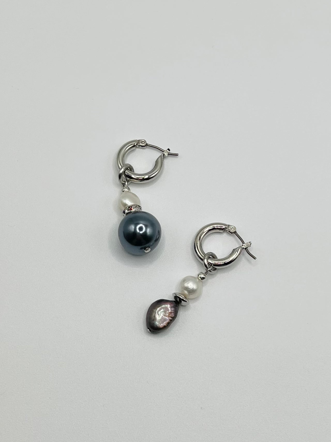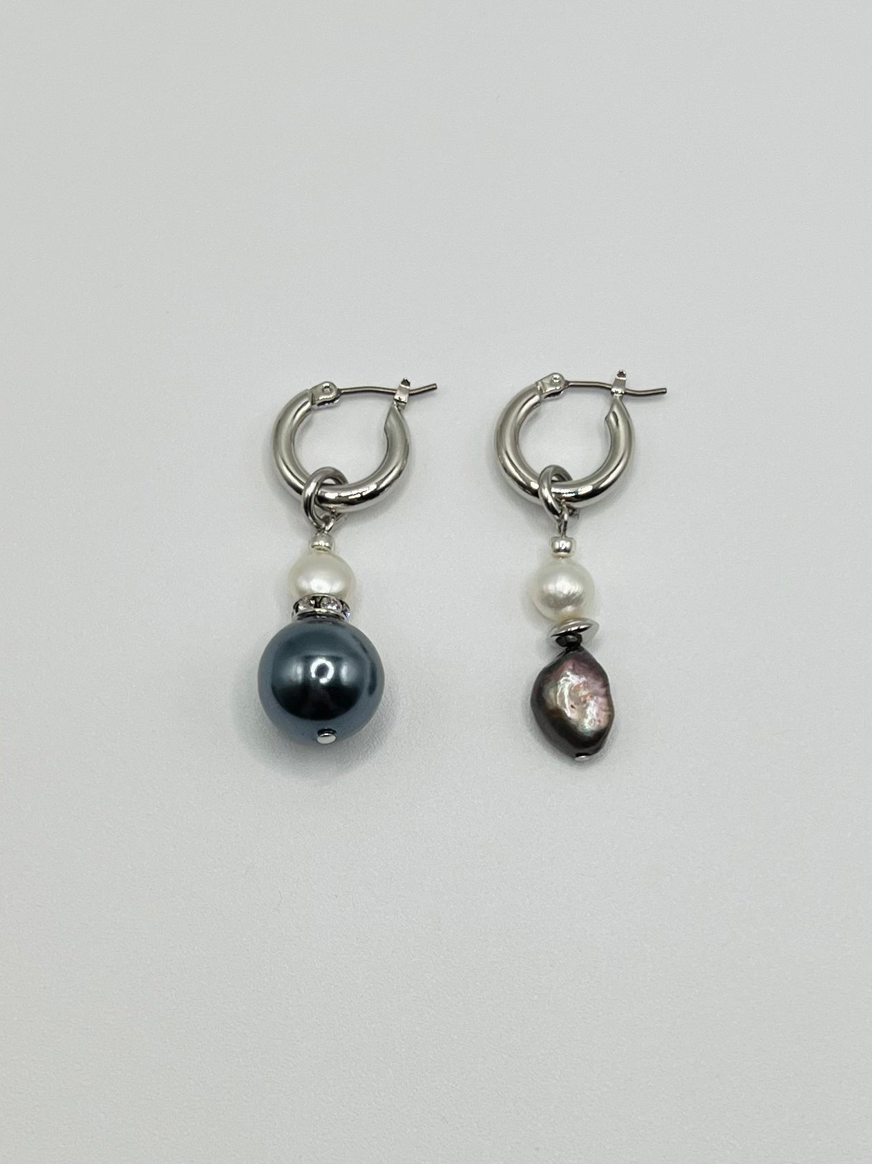 ディープネイビーパール、繊細な淡水パール、ペアで異なるデザインのフープピアス。